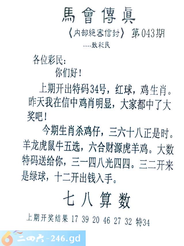 043期:首发推荐:≮馬會傳眞≯→(香港正版)