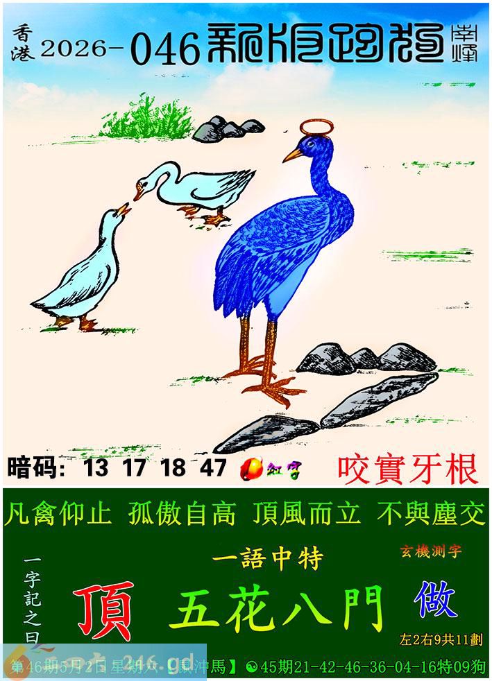 046期跑狗一字記之曰:【頂】 凡禽仰止,孤傲自高。 頂風而立,不與塵交。 玄機測字:《做》 一語中特:五花八門