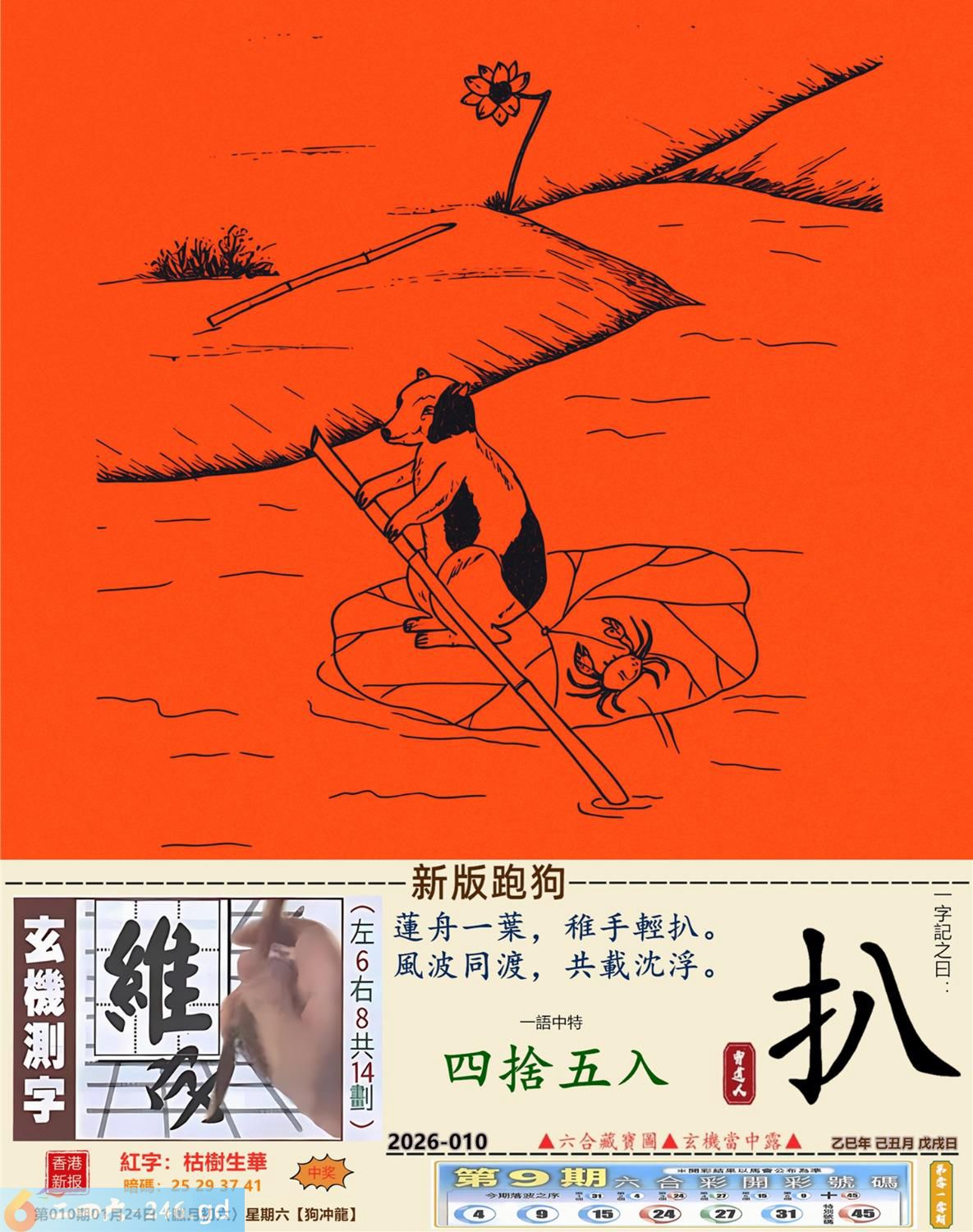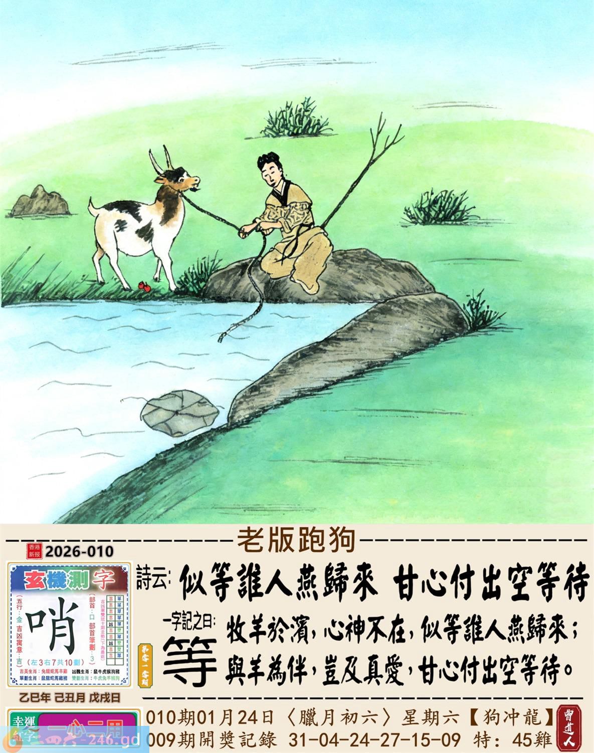 2026年1月24日010期龙(壬辰)(平地木) 010期:老版跑狗玄機一字記之曰:【等】 詩云:似等誰人燕歸來甘心付出空等待 牧羊於濱,心神不在,似等誰人燕歸來; 與羊為伴,豈及真愛,甘心付出空等待。 玄機測字:《哨》 密圖詩:山中無老虎 《記》:三門自有九尾數 特碼大小單雙句:抱着老婆暖被窩 今期必中:貂禪 010期:特碼歇后語 枣木疙瘩-----越老越结实 010期正版四字梅花诗:大张旗鼓。 010期火车头:烧伤马。诗:羊死龙伤,四书五经读一生。 010期香港第一手欲钱料:火。 010期曾道人说:“九?” 010期另版四字梅花诗:新春多福。 010期香港第一手欲钱料:欲钱找红色的动物。 010期曾道人说:“为什么春节期间家家户户都要放鞭炮呢”? 010期:二字經:深村 010期:路口有特码 010期:智力金壤; 010期:信箱紅字:【枯樹生華】 010期:【暗碼:25-29-37-41】 010期:一語中特:【四捨五入】 發財玄機圖:舐犢情深體型龐大圖中明牛藍綠 010期:藏寳圖 新:同向尘中叁拾载 老:秋槐叶落空宫里 禁:虎禁:1尾玄機字《辑》 2026年010期【生活幽默】版 〖分家産〗 一個富人快死了,分别给兩個兒子一把很鈍柴刀,説你們去砍一天的柴,誰砍的柴多,我就把家都給他。 大兒子拿了柴刀,急匆匆就上山砍柴去了。 二兒子拿過刀看了看,找了一把磨刀石,開始磨刀。 没過一會兒磨好了,拿着刀進屋對老爸説:"快把錢都拿出來!"