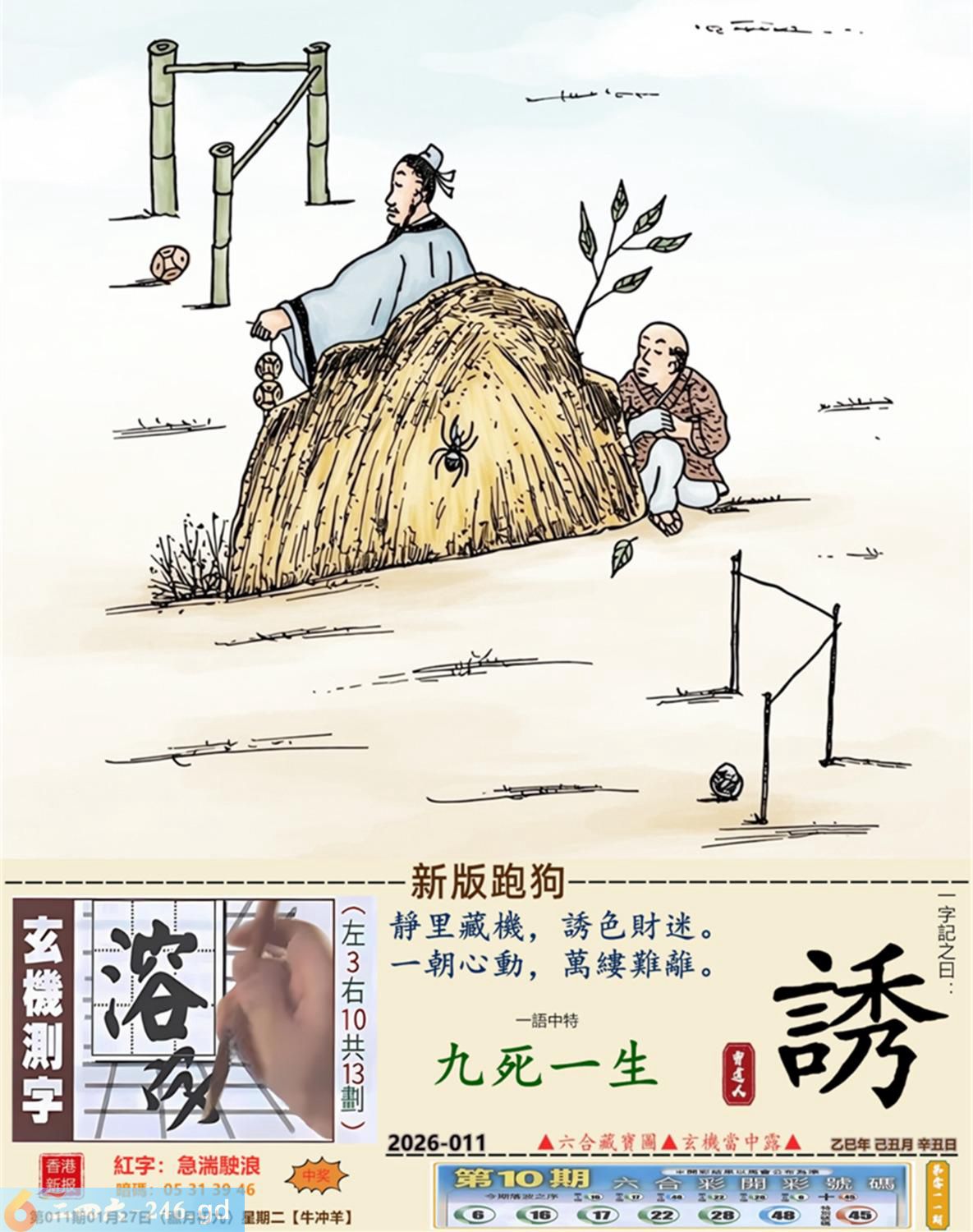 2026年1月27日011期羊(乙未)(壁上土) 011期:老版跑狗玄機一字記之曰:【走】 詩云:走為上着避鋒芒險境前前莫逞強 箭如雨下,如何能擋,走為上着避鋒芒; 君子不立,危牆中央,險境前前莫逞強。 玄機測字:《提》 密圖詩:酒足飯飽去按摩 《記》:同桌對座賽象棋 特碼大小單雙句:一窩鳥蛋有六個 今期必中:趙雲 011期:特碼歇后語 早上没刷牙-----嘴巴不干净 011期正版四字梅花诗:恕不奉陪。 011期火车头:烧伤龙。诗:鸡死猪伤,十二生肖排第四。 011期香港第一手欲钱料:龙? 011期曾道人说:“木?” 011期另版四字梅花诗:四面青山。 011期香港第一手欲钱料:欲钱找伶俐的动物。 011期曾道人说:“为什么每个人都比较喜欢钱呢”? 011期:二字經:好數 011期:电灯是特码 011期:智力金壤;一丝不挂 011期:信箱紅字:【急湍駛浪】 011期:【暗碼:05-31-39-46】 011期:一語中特:【九死一生】 發財玄機圖:冷静守候弓身嘶聲圖中明蛇紅綠 011期:藏寳圖 新:因想后湖题柱处 老:汉城黄柳映新帘 禁:虎禁:4尾玄机字《踌》 2026年011期【生活幽默】版 〖未來岳父〗 今天去女朋友家,心裏异常緊張。 晚上吃飯的時候,未来岳父多喝了兩杯,就跟我:"小李啊,我看你這人很有自信,胸懷寬廣,想必以後必成大器,女兒交給你我也就放心了。"聽得我那個高興,忙問這您也能看出來啊? 他回答道:"我瞧你長得這鳥樣,也敢泡我女兒,説明你這人不簡單。" 我......