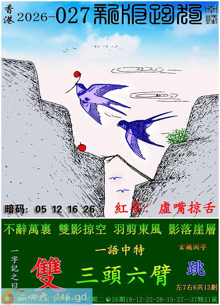 027期跑狗一字記之曰:【雙】 不辭萬裏,雙影掠空。 羽剪東風,影落崖層。 玄機測字:《跳》 一語中特:三頭六臂