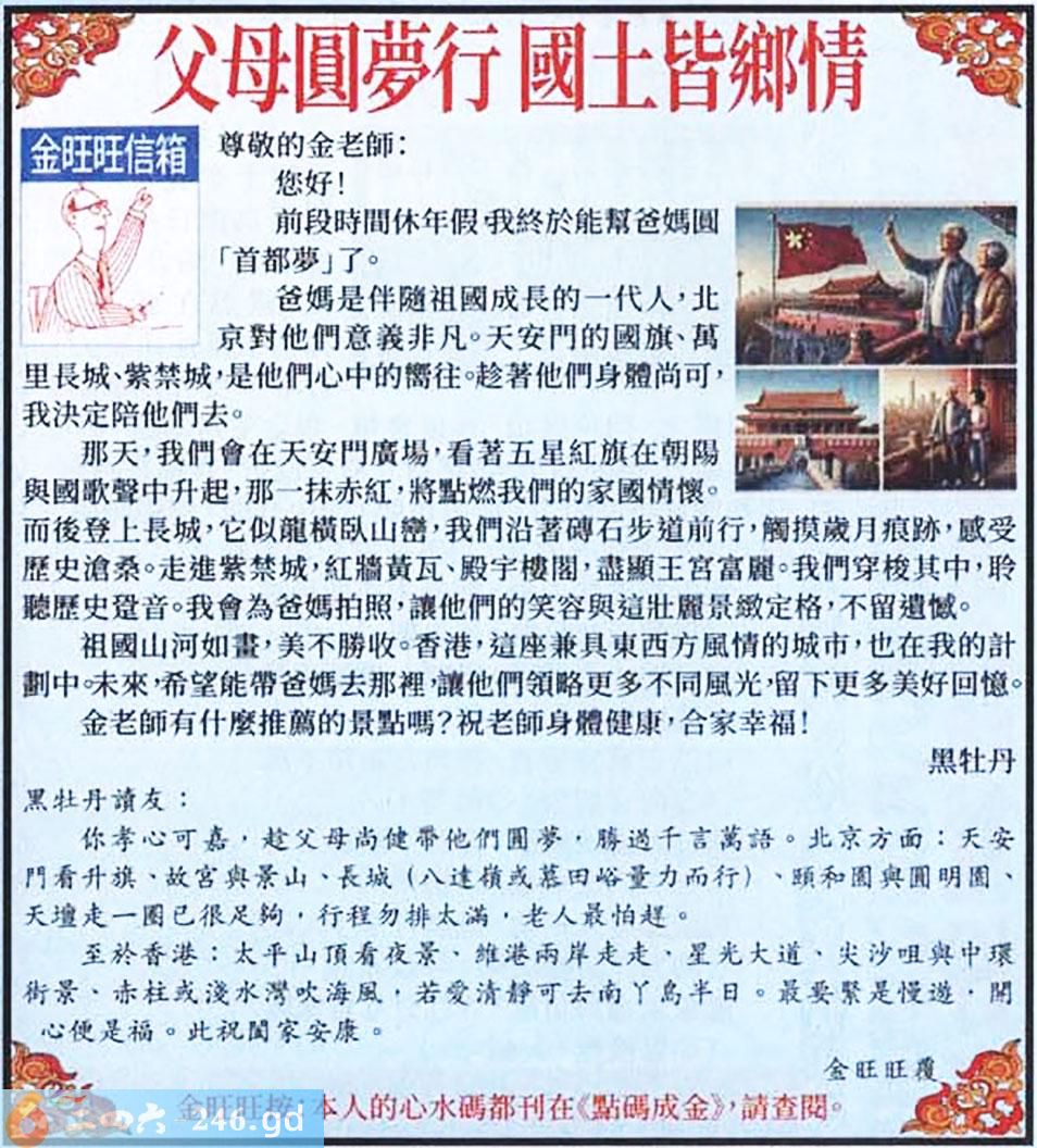 034期:金旺旺信箱彩民推荐→→《父母圓夢行 國土皆鄉情》