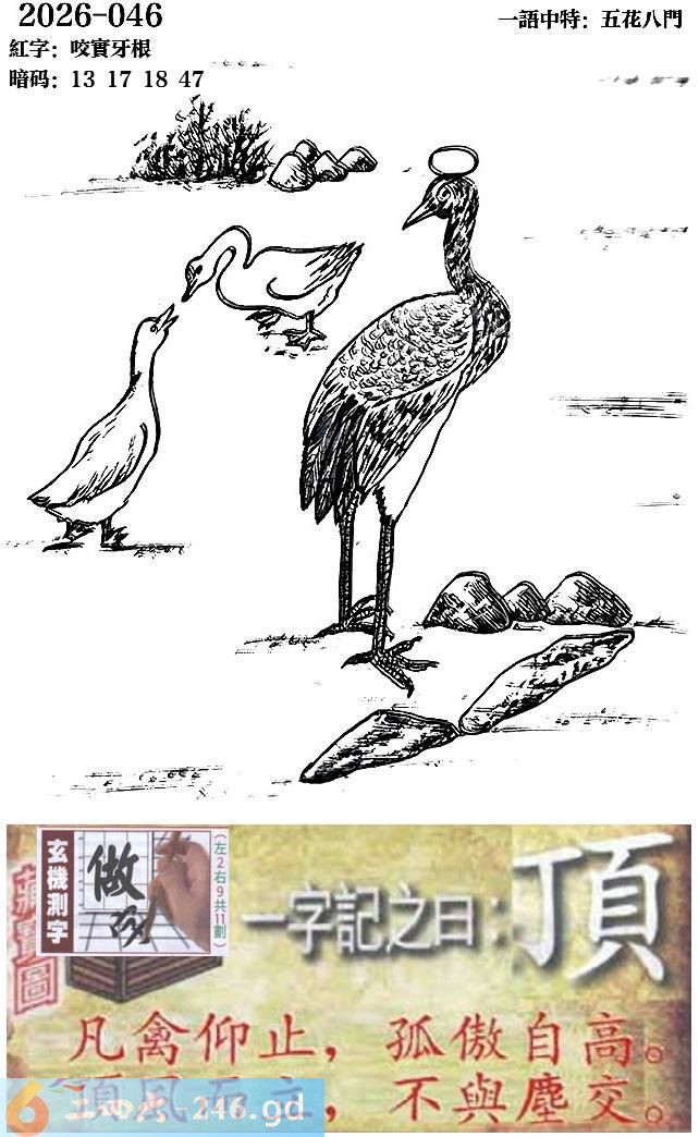 046期跑狗一字記之曰:【頂】 凡禽仰止,孤傲自高。 頂風而立,不與塵交。 玄機測字:《做》 一語中特:五花八門
